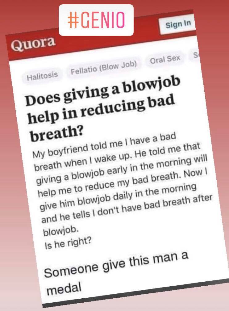 Okei! Titolo forte, forse forzato, ma dopo aver letto questo post di una ragazza che racconta di come grazie al consiglio del fidanzato di praticare sesso orale la mattina, non ha più l'alito puzzolente.